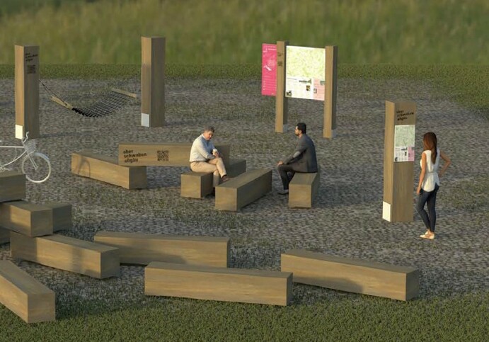 Die Installation „Weitblick“ beinhaltet neben Sitzgelegenheiten für radelnde Familien/Gruppen auch ein Panoramaelement mit Blickpunktbestimmung. Die Installation soll damit nicht nur zur Rast vor der Kulisse der barocken Schlossanlage Altshausen am Rande des Marktplatzes einladen, sondern auch zum Austausch über die ausgewiesenen Blickpunkte (historische Bebauung, barocke Schlossensemble mit Kavaliersgebäuden) beitragen und Gespräche innerhalb der eigenen Nutzergruppe, mit weiteren Nutzern außerhalb der Gruppe (Austausch zwischen Einheimischen/Bürgern und Gästen) oder auch zwischen den Generationen anregen.