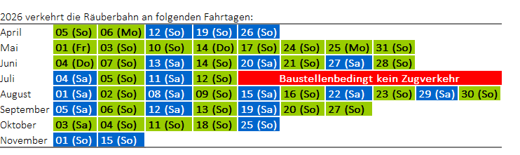 Und auch danach ist noch nicht Schluss: Im Herbst geht es mit unserer ehrenamtlich betriebenen Bürgerbahn in die Nachsaison, sodass ihr auch dann noch die Gelegenheit habt, eine Fahrt mit der Räuberbahn zu genießen.